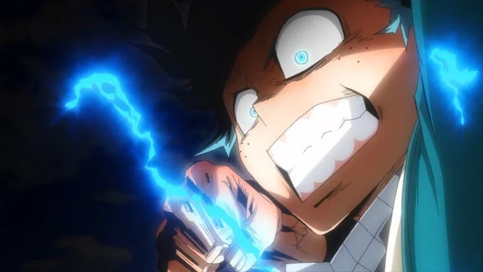 The art style in this sequence vaguely reminds me of Mob Psycho with the certain color palettes Studio Bones uses in the “fist image.” One might even say that seeing Deku at full power for the first time feels intimidating.