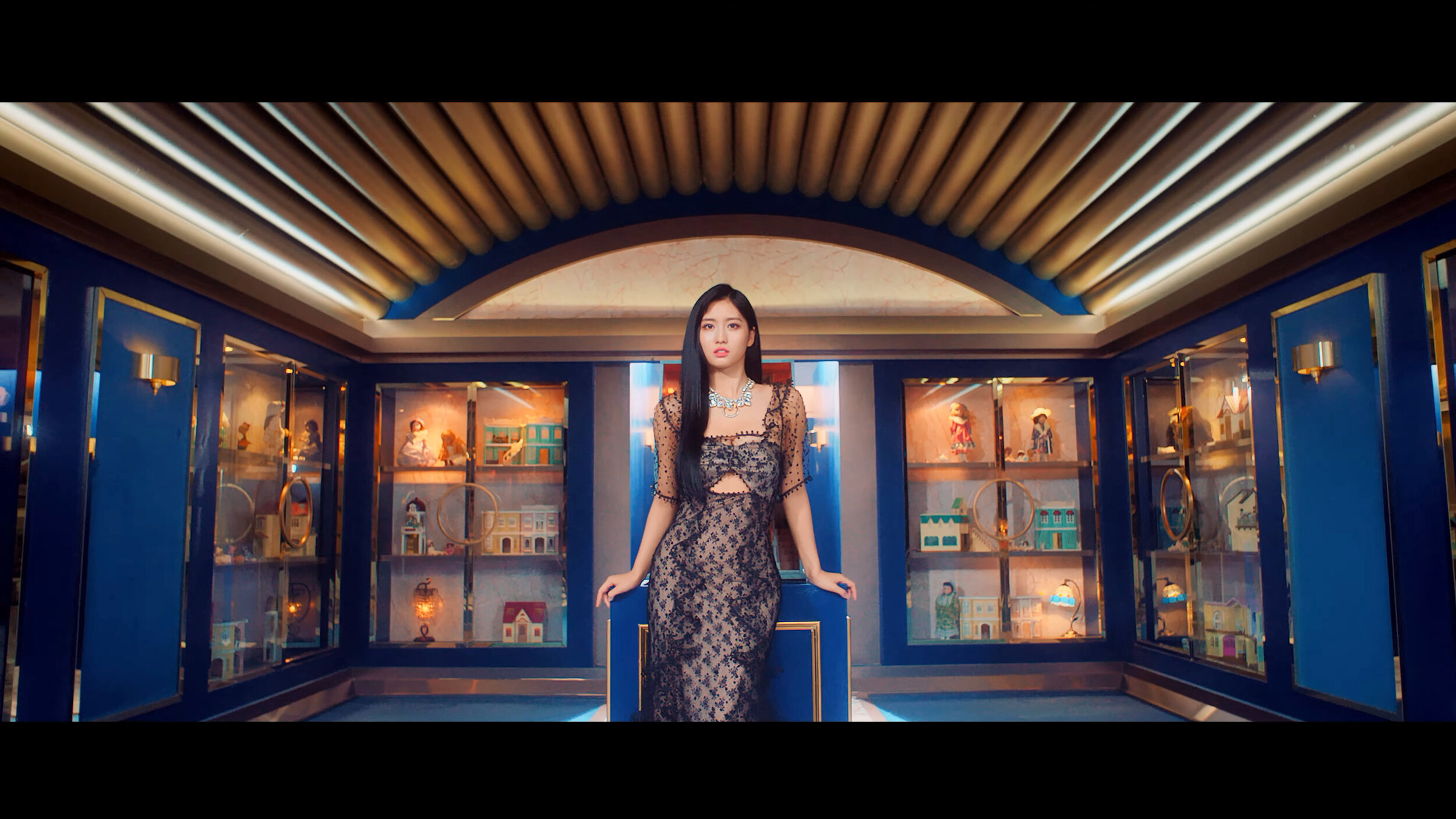 Dressed very elegantly (with no bangs), and she is in a room surrounded by dollhouses in display cases.